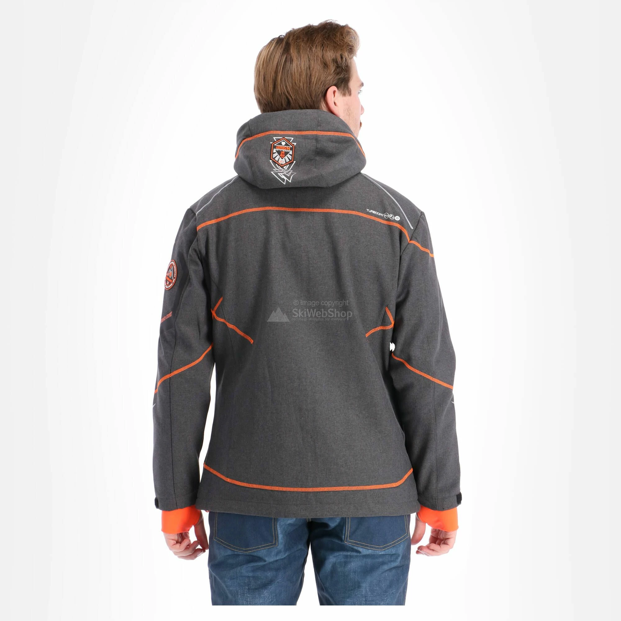 - The softshell ski-jacket has a detachable and adjustable hood.