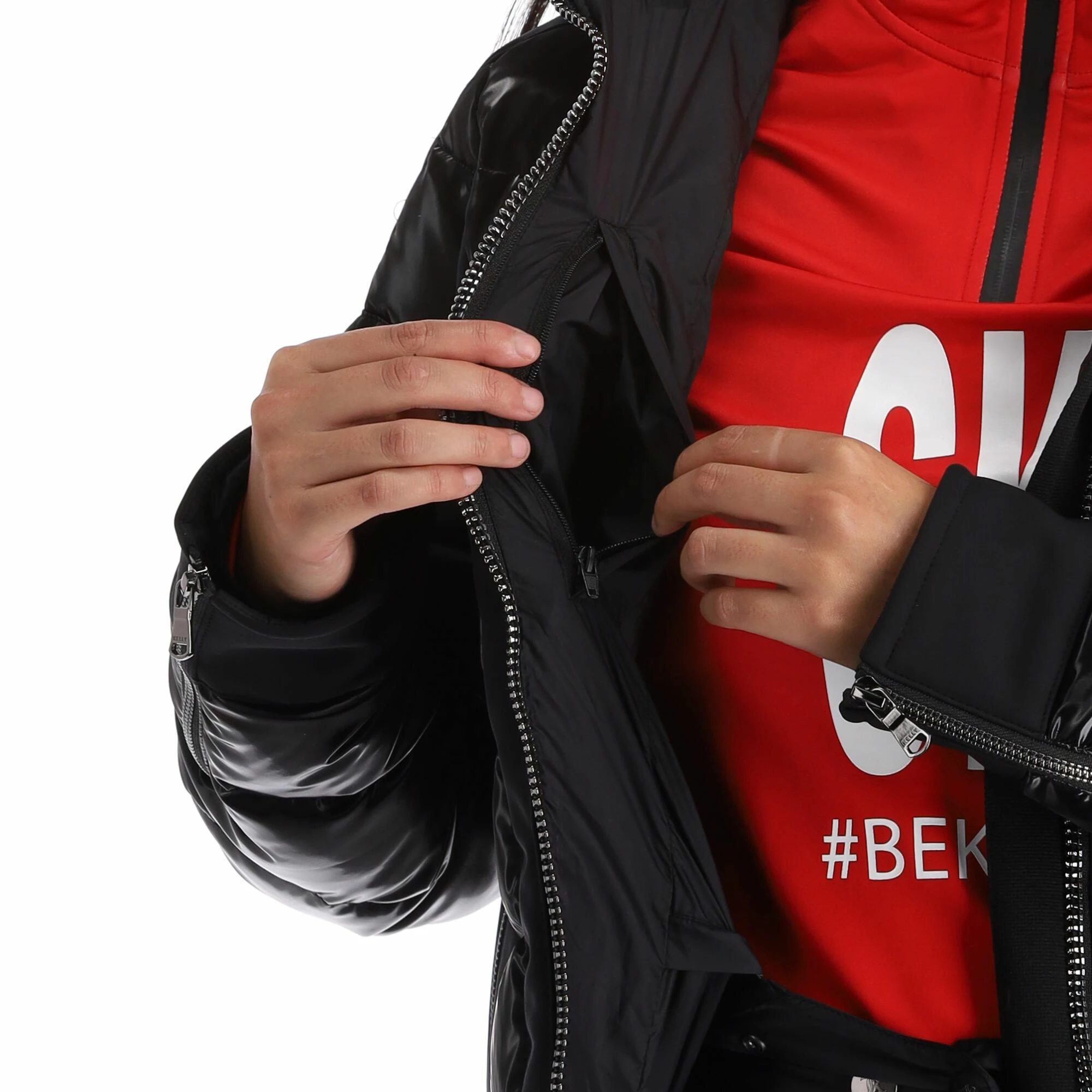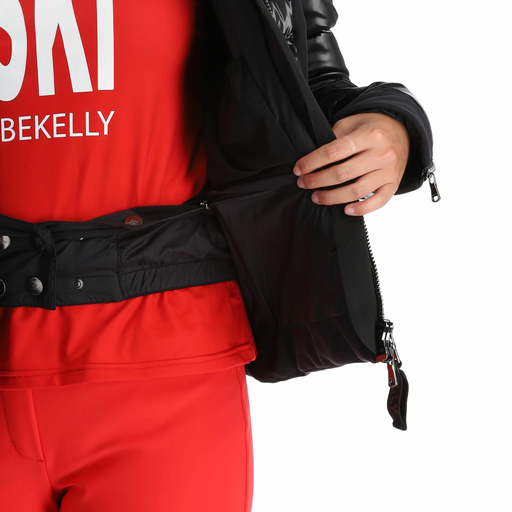 - Cremallera de 2 vías The large zipper on the front of the ski jacket can be opened both from above and below.
