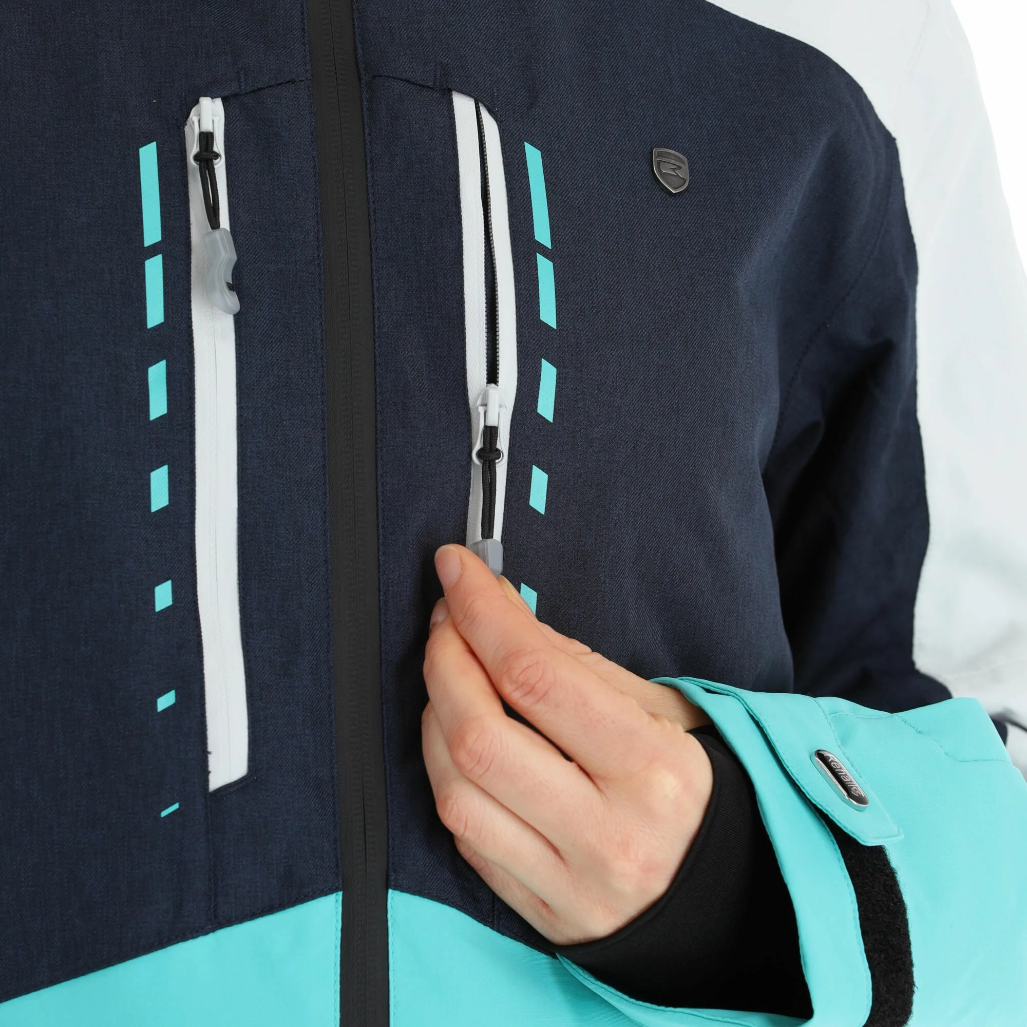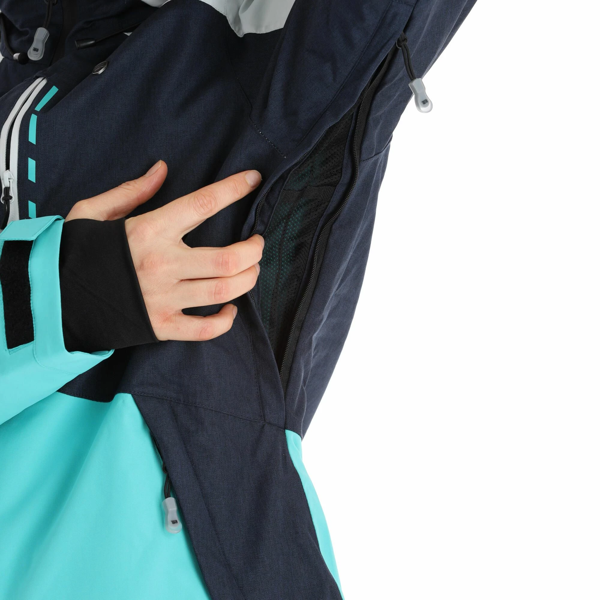 - Cremalleras de ventilación debajo Your body temperature can be well regulated with the ventilation zippers in your ski jacket. You can choose yourself whether you want the zippers open or closed.