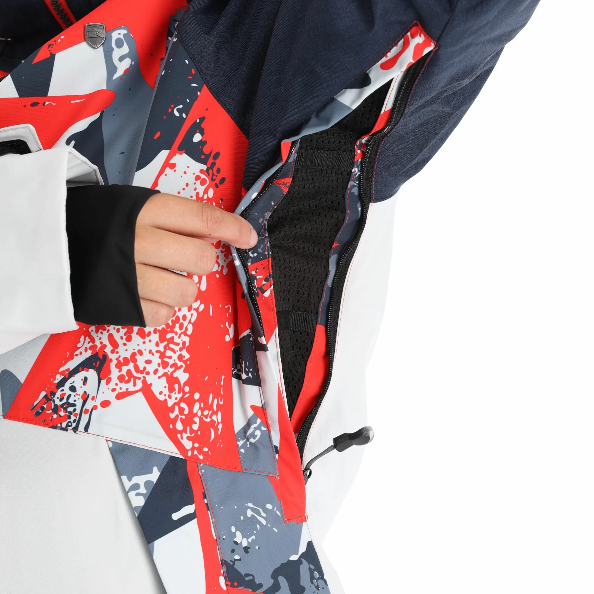 - Cremalleras de ventilación debajo Your body temperature can be well regulated with the ventilation zippers in your ski jacket. You can choose yourself whether you want the zippers open or closed.